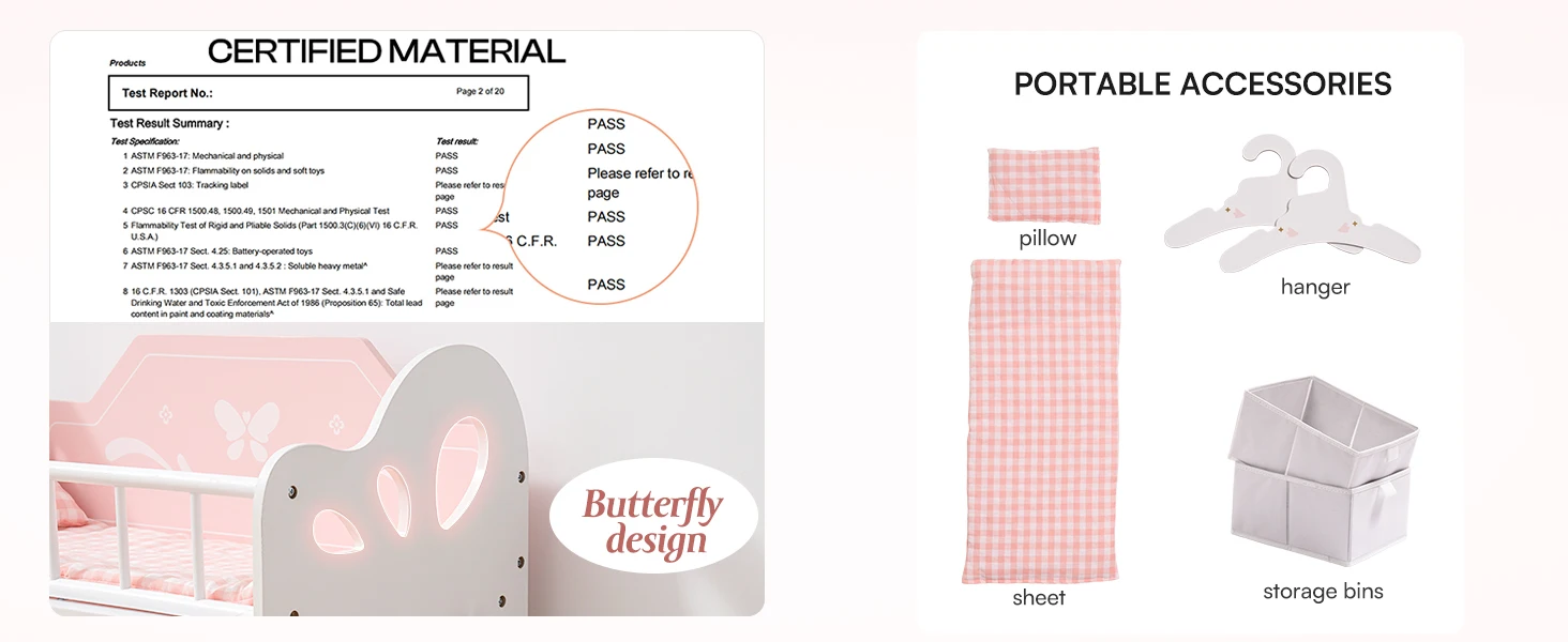 Crafted from high-quality natural wood, this baby doll crib is non-toxic, odorless, and built to last. Compared to plastic, wooden materials offer a more eco-friendly, sturdy, and healthier alternative for your child’s playtime.