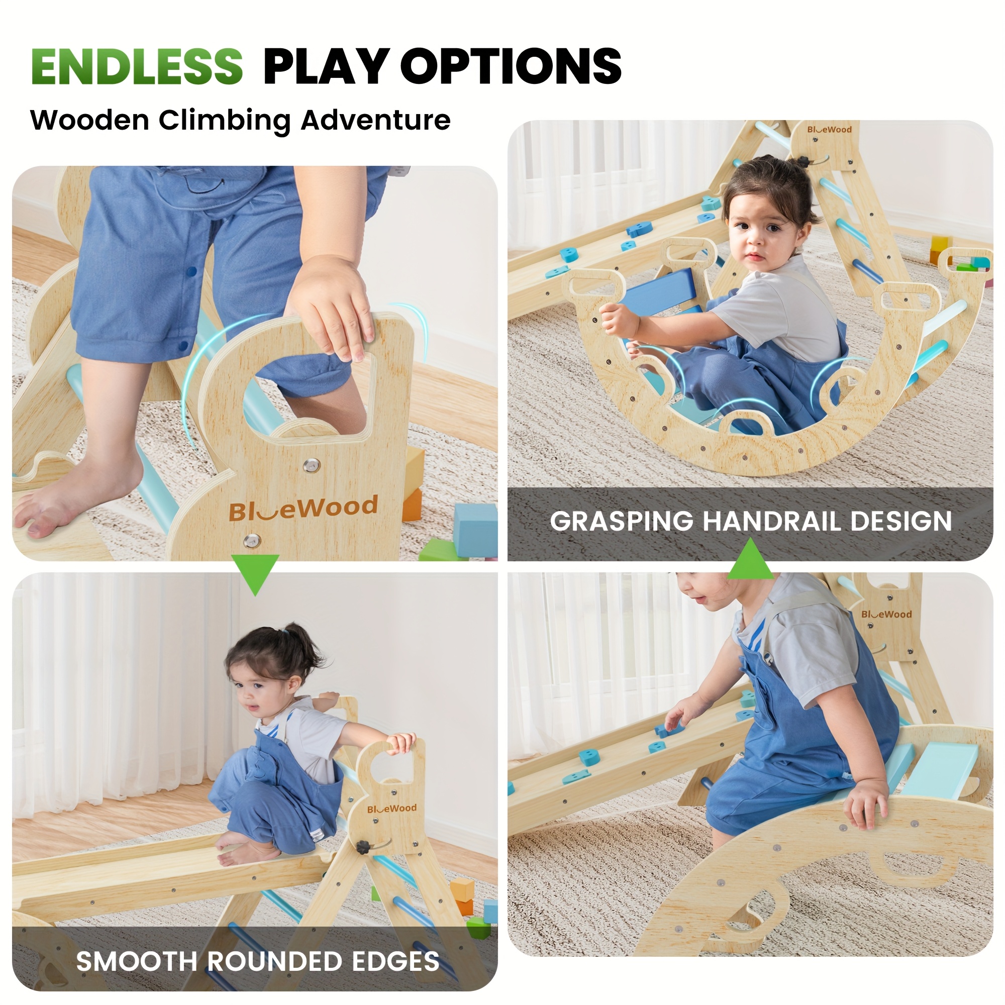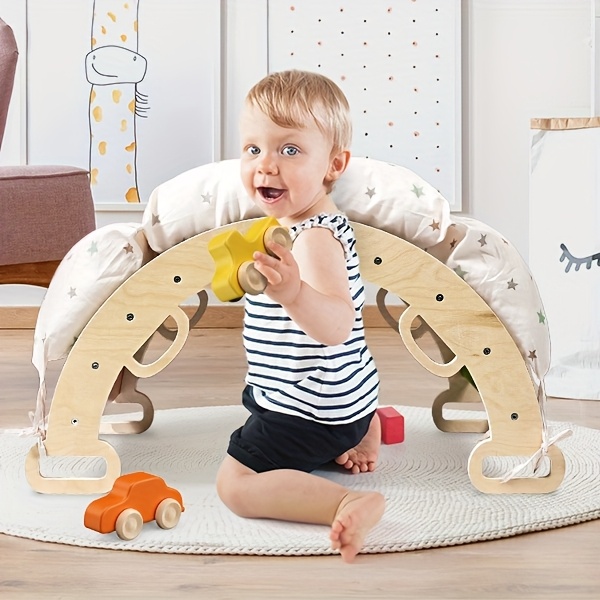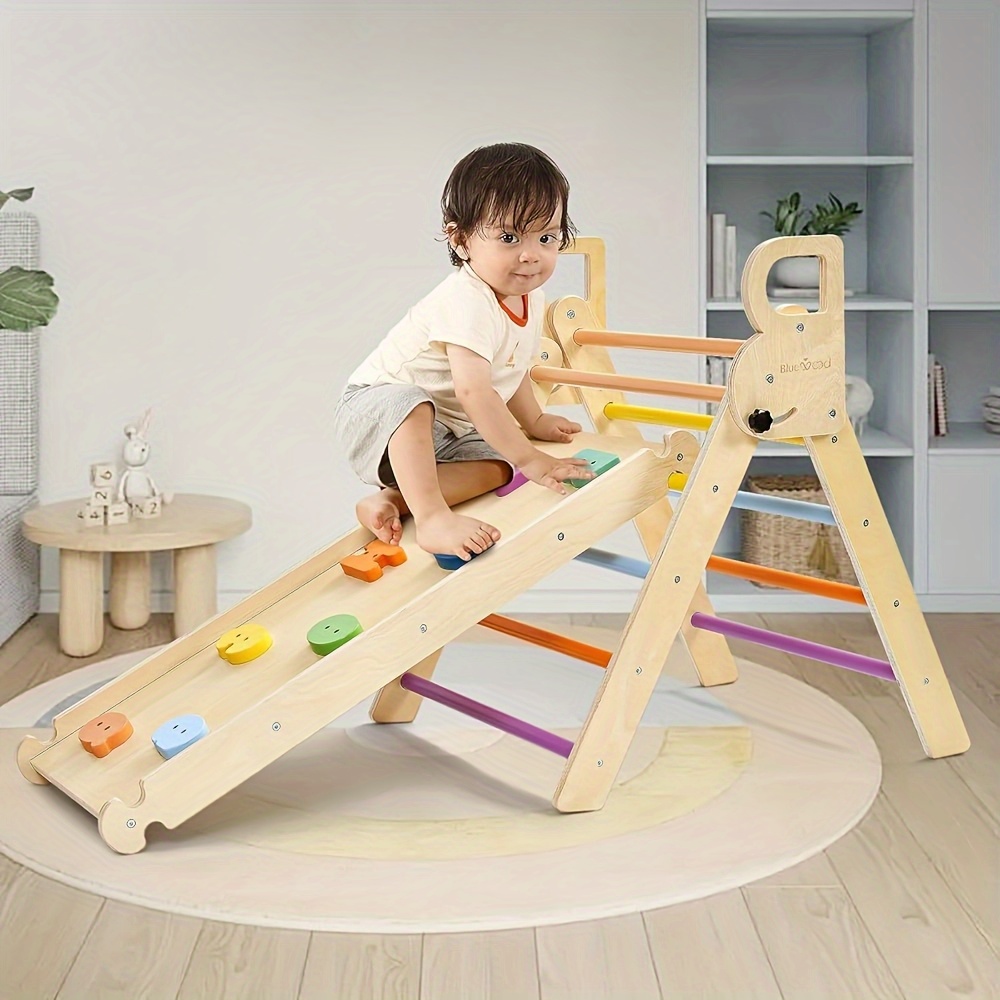 Designed for little explorers ages 7 months and up, this foldable wooden gym grows with your child through multiple configurations—triangle climber, reversible slide, arching rocker, and more.