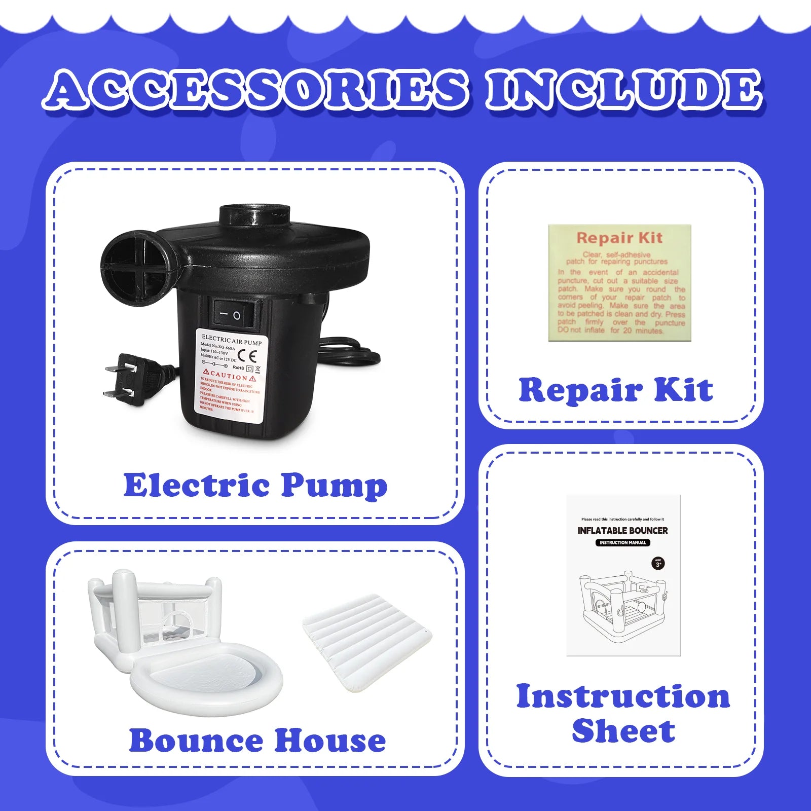 Quality Assurance: Heavy-duty puncture-proof material, double-needle to quad-needle stitching, and the jumping area is surrounded by a mesh net to protect your child from falling while jumping. The safety net is connected by four inflatable columns, which can obtain stable support and enhance safety. In addition, parents can clearly observe their children playing in different entertainment areas from all directions